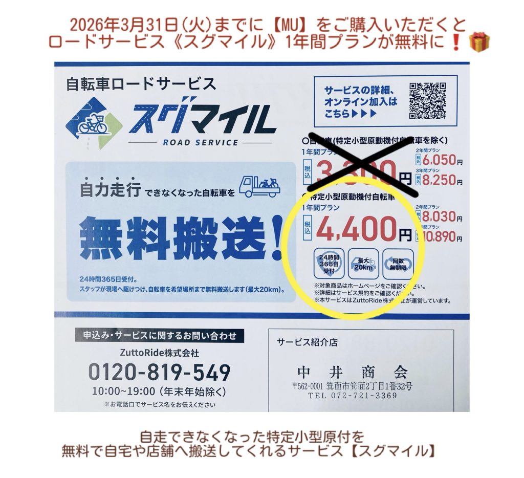 期間中に特定小型原動機付自転「MU」をご購入いただくと ロードサービス「スグマイル」1年間プランの年会費4,400円が割引されます♪