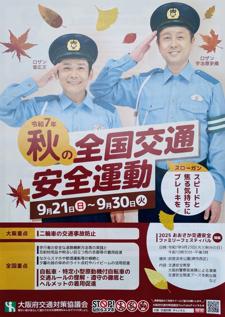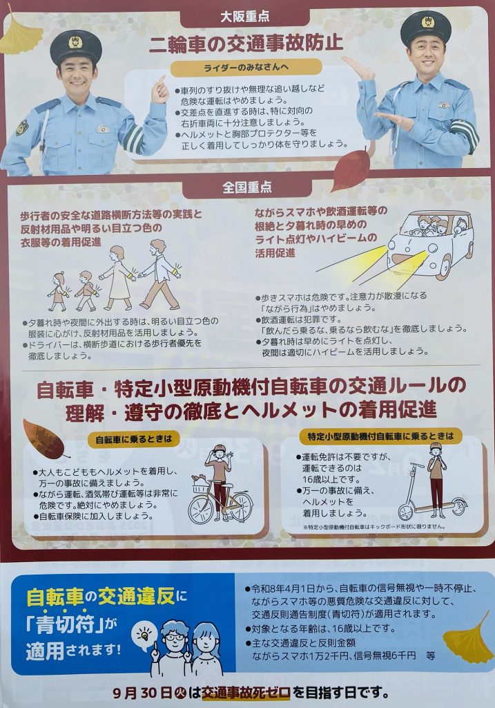 秋の全国交通安全運動 ようやく秋の訪れを感じられるようになってきましたね🎑 日も短くなってきました🌆 今年も始まりましたよ! 思いやりのある運転を心がけたいですね🍀 日時 : 9月21日(日)〜9月30日(火) 2025/09/22