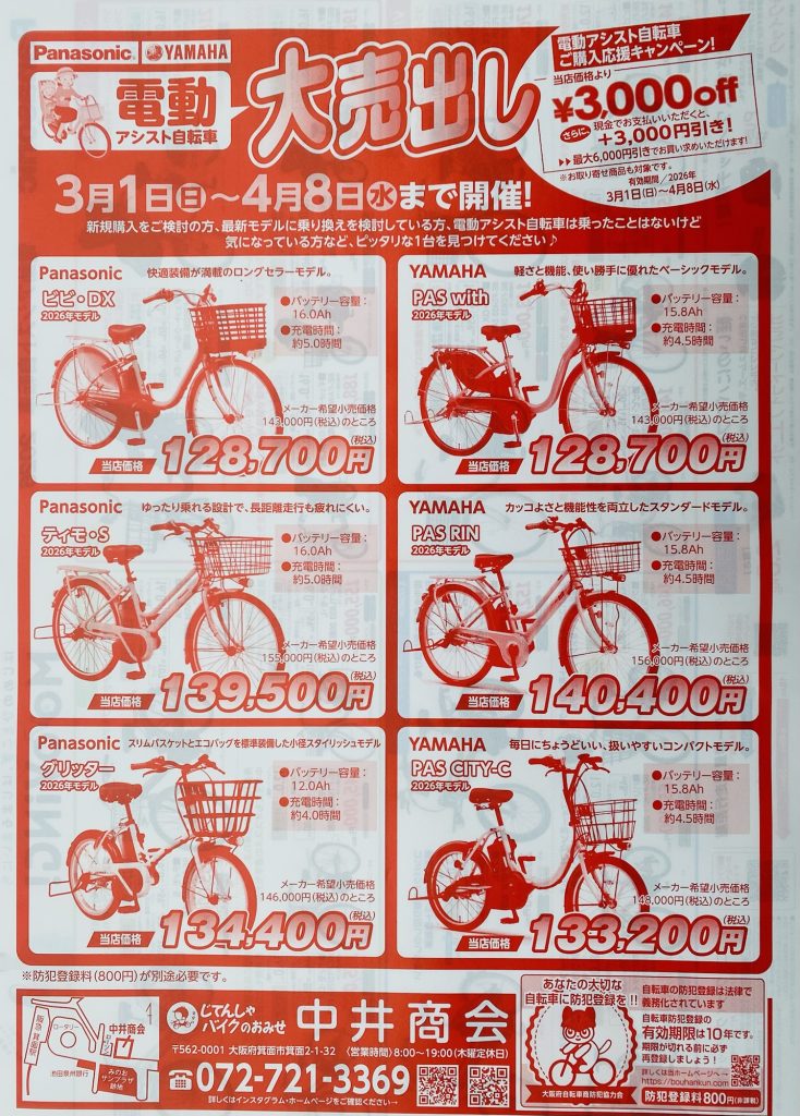 今年も中井商会では電動アシスト自転車の大売出しを行います♪