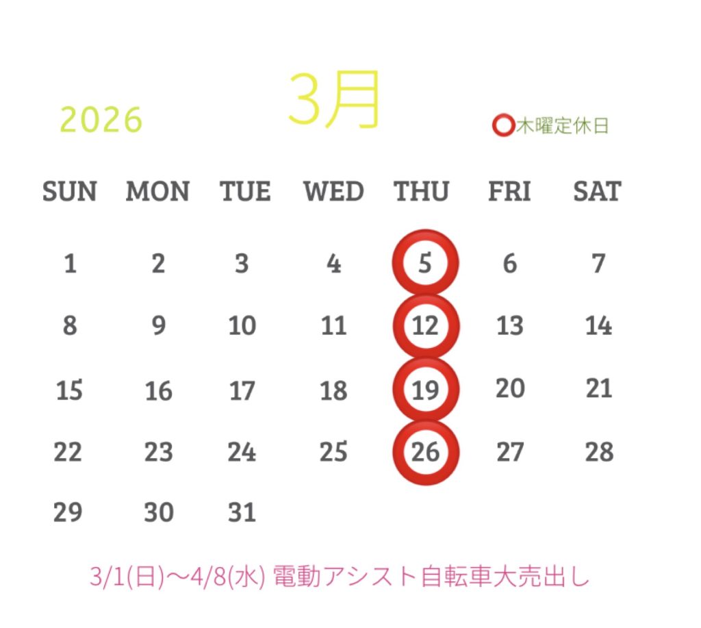 3月の営業日🎎 雪降る2月が終わり、いよいよ3月ですね☀️ 日ごと、春の気配を感じてうれしくなります🌷 3月は電動アシスト自転車の大売出しをしますので、どうぞみなさまお越しください♪ 2026/02/27